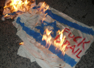 Ενώ επίσημα αναγκάζονται να υποστηρίξουν έστω στα λόγια τους Παλαιστίνιους καίγεται η καρδιά τους όταν βλέπουν κάποιους «κακούς φασίστες» Παλαιστίνιους , «ισλαμοφασίστες» όπως λέει και το terminal 119 να καίνε το σύμβολο των γιων του Δαυίδ. Αυτόνομοι Σύντροφοι μαζί με ανένταχτους συμπατριώτες μας ανεξαρτήτως πολιτικών θέσεων αλλά με κοινό γνώρισμα το μίσος μας για την Ισραηλινή ιμπεριαλιστική πολιτική βροντοφώναξαν συνθήματα υπέρ της Παλαιστινιακής αντίστασης και ενάντια στον Σιωνισμό.