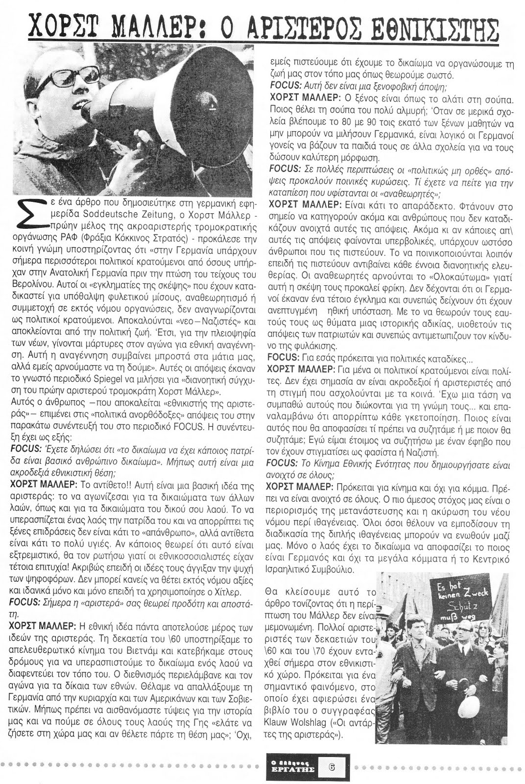 Να μην ξεχνάμε συναγωνιστές ότι οι αντιφασίστες ακροδεξιοί υπερασπίζονται σήμερα με πάθος ,το ίδιο κράτος που σκοτώνει με τις παράνομες διαφημιστικές πινακίδες στις εθνικές οδούς δεκάδες οδηγούς , που δολοφονεί με το νερό - δηλητήριο σε πόλεις και χωριά χιλιάδες συμπατριώτες μας καθημερινά , που διώκει Εθνικιστές και Εθνικοσοσιαλιστές σε ένα νέο ξέφρενο «κυνήγι μαγισσών».