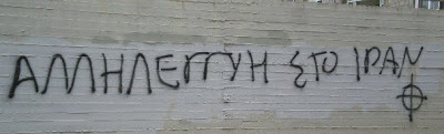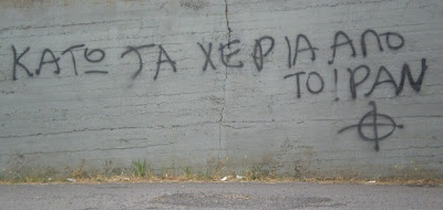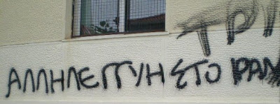 Δεν στάθηκε δυνατόν λόγω των τραγικών εξελίξεων να δημοσιεύσουμε έγκαιρα τις παρακάτω ενδεικτικές φωτογραφίες από την αναγραφή πολλών συνθημάτων σε κεντρικά σημεία πόλεων και πολύ κοντά σε στρατιωτική βάση όπου στάθμευαν εκείνη την περίοδο Ισραηλινά μαχητικά.
