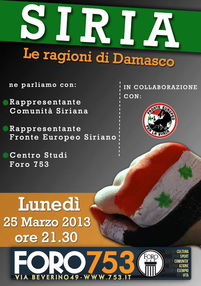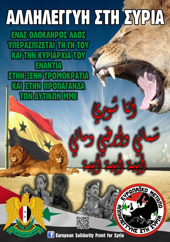 Πριν από λίγο καιρό, ακτιβιστές από διάφορες χώρες της Ευρώπης, μεταξύ αυτών και της Ελλάδος, αποφάσισαν να αναλάβουν δράση υπέρ του αγώνα που δίνει ο Συριακός λαός και η κυβέρνηση της Συρίας για ειρήνη - επιβίωση - ανεξαρτησία. Έτσι, διάφορες ομάδες, οργανώσεις, ιστοσελίδες και άτομα ένωσαν τις δυνάμεις τους κάτω από την κοινή σημαία "Ευρωπαϊκό Μέτωπο Αλληλεγγύης στη Συρία".