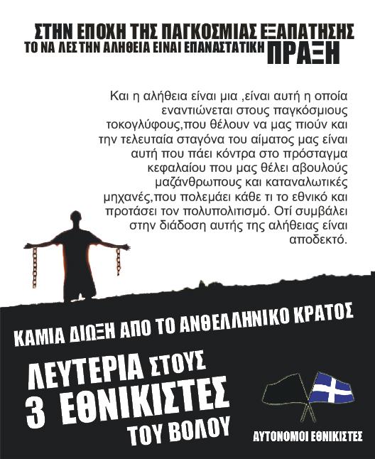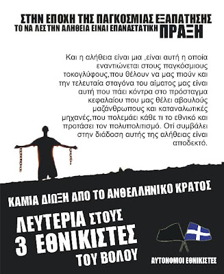 Στις 28 Μαρτίου 2013, οι πραιτωριανοί ανακοίνωσαν ότι έπιασαν τρεις νεαρούς εθνικιστές που φέρονται να έβαλαν φωτιά στην τράπεζα Κύπρου στον Βόλο. Δεν ξέρω τί στάση θα κρατήσουν οι τρεις αιχμάλωτοι πολέμου για όσα τους προσάπτει το κατοχικό καθεστώς. Ξέρω τί στάση θα κρατήσω εγώ. Όπως και στην περίπτωση του αναρχικού αντάρτικου πόλεων, έτσι και στην περίπτωση του εθνικιστικού αντάρτικου πόλεων, οι αιχμάλωτοι πολέμου θα έχουν την έμπρακτη συμπαράστασή μου, αν την ζητήσουν.