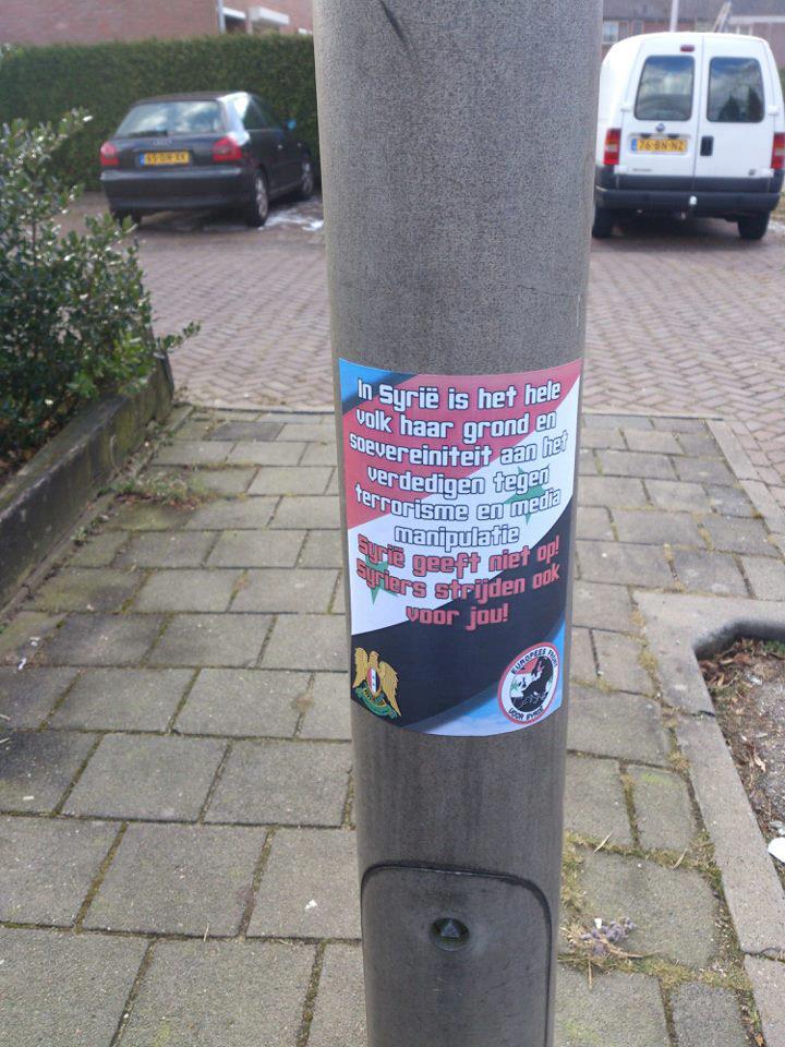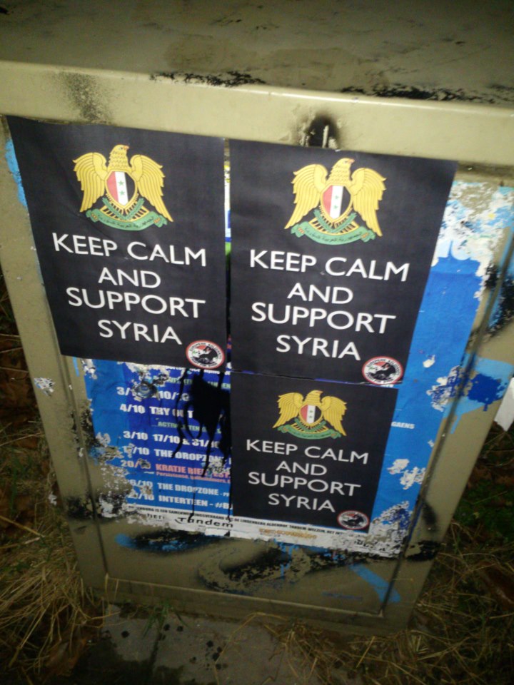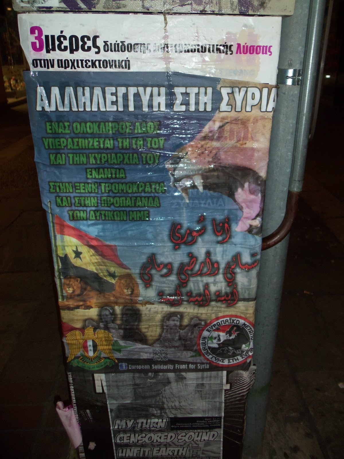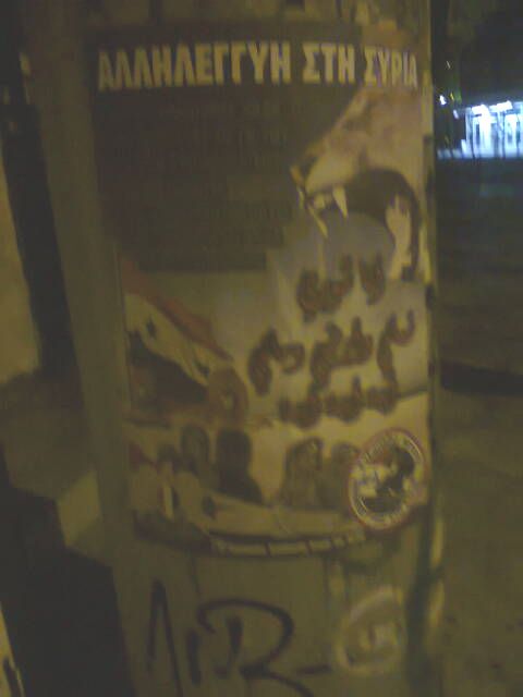 Αφισοκόλληση πραγματοποιήθηκε σε δρόμους του Πύργου από αλληλέγγυους ακτιβιστές δείχνοντας την συμπαράσταση τους στην κυβέρνηση του Bashar al - Assad και του συριακού λαού για ανεξαρτησία και επιβίωση. Η αφισοκόλληση έγινε σε κεντρικά σημεία της πόλης όπου η διέλευση των πολιτών είναι πολύ συχνή και κοντά στο χώρο του Τ.Ε.Ι.