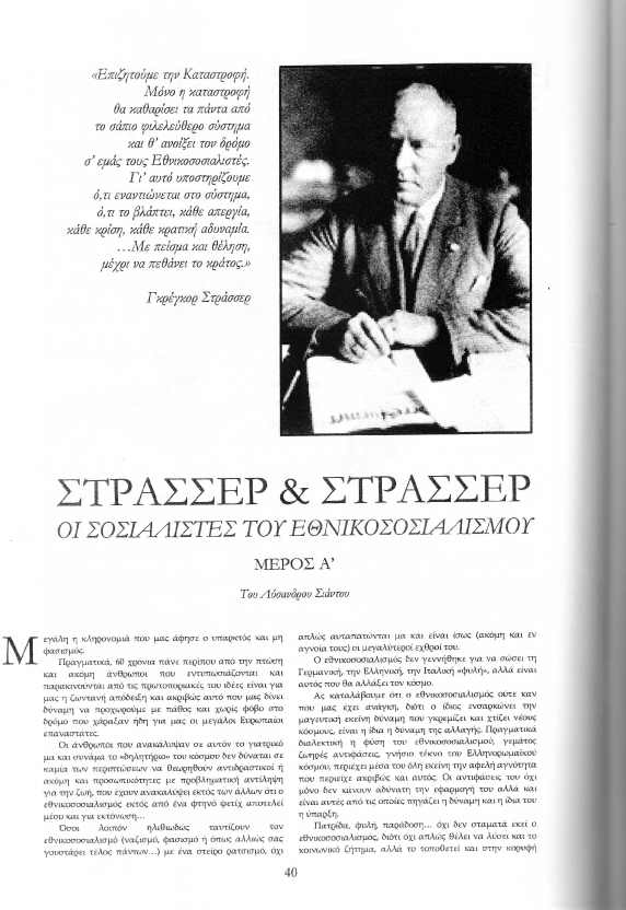 Στον πόλεμο της Γιουγκοσλαβίας παρά την ιδεολογική συγγένεια με τους Κροάτες Φασίστες ο «εθνικός χώρος» - με εξαίρεση τους Εθνικοσοσιαλιστές και Φασίστες εντός και εκτός «Χρυσής Αυγής» - στήριξε μετά μανίας το Σερβικό κομμουνιστικό καθεστώς του Μιλόσεβιτς (...) και τους Σέρβους Μοναρχικούς αντιναζί ακροδεξιούς της Βοσνίας παρά την ιστορικά δικαιωμένη επιλογή των υπολοίπων εθνών της Γιουγκοσλαβίας για οριστική απεξάρτηση τους από το Βελιγράδι. Μια επιλογή που επέλεξε φυσικά την εποχή εκείνη και το καθεστώς του εβραίου Μητσοτάκη με πάτρωνα όλων φυσικά το Ισραήλ, αλλά και οι ρασοφόρες ηγετικές ύαινες της Εκκλησίας της Ελλάδος. Ένας κόσμος πλασμένος - αμέσως μετά την κατάρρευση της ΕΣΣΔ - στα καλούπια μιας πλαστής «φιλίας» προς το νέο ολιγαρχικό καθεστώς της Ρωσικής ομοσπονδίας για την εξυπηρέτηση των ηγετών του Κρεμλίνου, οι οποίοι έπαιξαν φυσικά για πολλοστή φορά τα χαρτιά της διαπλεκόμενης ηγεσίας της Ορθοδοξίας προς ενίσχυση των δικών τους γεωπολιτικών συμφερόντων.