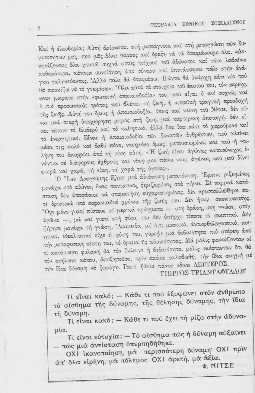 Ακόμη και αν οι οικονομικές προτάσεις μιας εθνικιστικής ιδεολογικής τάσης ακούγονται παρωχημένες, σκοπός του εθνικιστή διανοητή είναι να τους δώσει ξανά την ιστορική τους ευστοχία. Όχι να τις απορρίψει και να καταφύγει σε δάνεια της κυρίαρχης ιδεολογίας. Γιατί τότε, όπως κάποιοι κατηγορούν ορισμένους για εμμονή σε παλαιοσοσιαλιστικά κατάλοιπα άλλοι θα κατηγορήσουν αυτούς για υποταγή στα κελεύσματα της κυρίαρχης ιδεολογίας.
