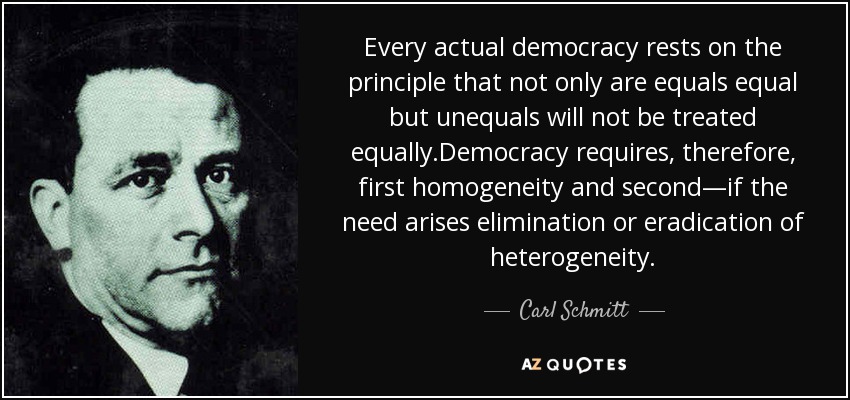Η κριτική της σμιτιανής θεωρίας στον φιλελευθερισμό δεν σταματάει όμως εκεί και ειδικά εις ότι έχει να κάνει με την φιλελεύθερη εκδοχή της δημοκρατίας. Πέραν από την εμπορευματοποίηση ή τον εξωραϊσμό του «Εχθρού», η δημοκρατία, ειδικά με την φιλελεύθερη μορφή της στην σμιτιανή θεωρία, είναι απολύτως αναποτελεσματική και υποκριτική στην αντιμετώπιση του Εχθρού και κατά συνέπεια στην επιβίωση του Έθνους. Ο Schmitt πραγματεύεται ότι η δημοκρατία πρέπει να βασίζεται συνεχώς στην συναίνεση του λαού, ειδάλλως εκλείπει η «δημοκρατικότητα» της. Αν το σκεφτεί κανείς αυτό θα καταλάβει την σημασία και την αποτυχία ή υποκρισία του «φιλελεύθερου» ειδικά συστήματος δημοκρατίας. Οι αποφάσεις, οι οποίες λαμβάνονται, συνεχίζει ο Schmitt, άνευ της συναίνεσης του κόσμου, από τους «αντιπροσώπους του» δεν είναι τίποτε άλλο παρά μία μορφή «δικτατορίας», καθώς υπάρχει η έλλειψη της συναίνεσης του λαού, κατά την νομοθέτηση.