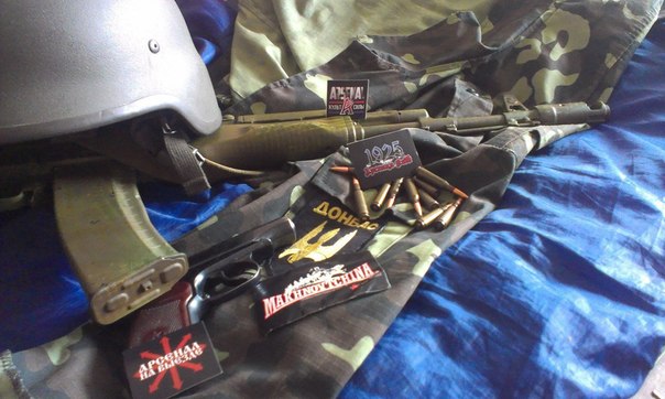 Ανάμεσα στο αυτοκόλλητο του Χάους και το κράνος ένα όπλο με σφαίρες, η διάσημη Ουκρανική Εθνικιστική Τρίαινα και το σύμβολο του Μαχνοβτσίνα (κίνημα του Μαχνό) ...