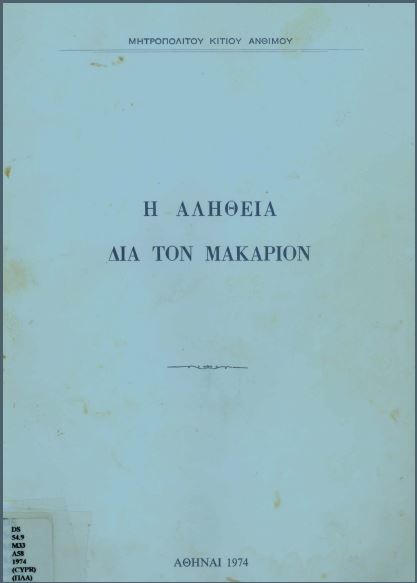 Ο καθαιρεμένος μητροπολίτης Άνθιμος, από την Αθήνα όπου ζούσεαυτοεξόριστος, εξέδωσε το 1974 (λίγο πριν το πραξικόπημα και την τουρκική εισβολή στην Κύπρο) το βιβλίο "Η αλήθεια δια τον Μακάριον", μέσα από το οποίο προσπαθούσε να αποκαθηλώσει τον Μακάριο και να γνωστοποιήσει στο κοινό τις δικές του θέσεις.