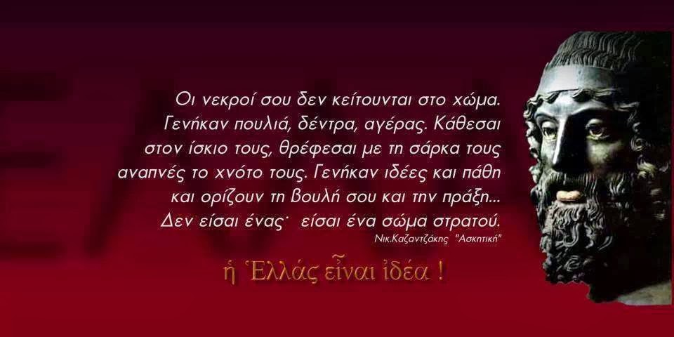 Μονάχα εκείνος λυτρώθηκε από την κόλαση του εγώ του που νιώθει να πεινάει, όταν ένα παιδί της ράτσας του δεν έχει να φάει, και να σκιρτάει πασίχαρος, όταν ένας άντρας και μια γυναίκα του σογιού του φιλιούνται. Όλα τούτα είναι μέλη του μεγάλου ορατού κορμιού σου. Πονάς και χαίρεσαι σκορπισμένος ως τα πέρατα της γης μέσα σε χιλιάδες ομοαίματα κορμιά.Όπως μάχεσαι για το μικρό σου σώμα, πολέμα και για το μεγάλο. Πολέμα όλα τούτα τα κορμιά σου να γίνουνε δυνατά, λιτά, πρόθυμα. Να φωτιστεί ο νους τους, να χτυπάει η καρδιά τους φλεγόμενη, γενναία, ανήσυχη.