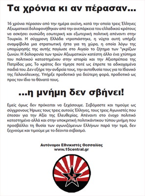 Με επιτυχία πραγματοποιήθηκε στην Καρδίτσα ανοικτή συγκέντρωση συντρόφων για τον θάνατο των τριών Ελλήνων Αξιωματικών στα Ίμια το 1996. Στην εκδήλωση καλούσαν Αυτόνομοι σύντροφοι από τη Θεσσαλία καθώς και το τοπικό Δίκτυο της Καρδίτσας.